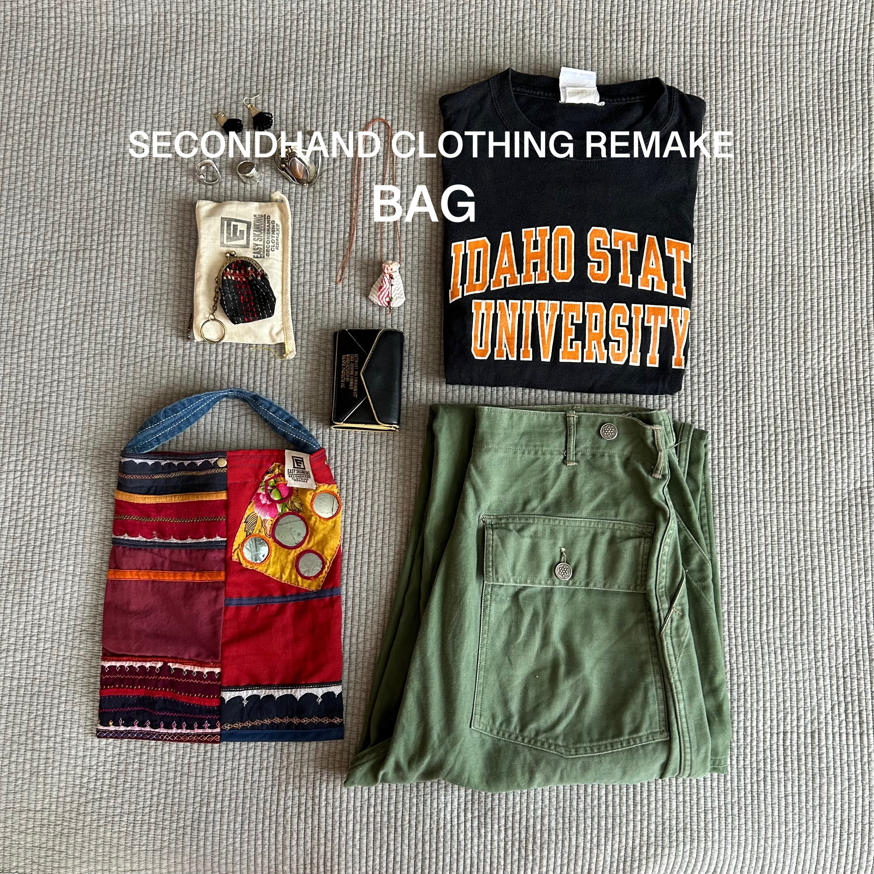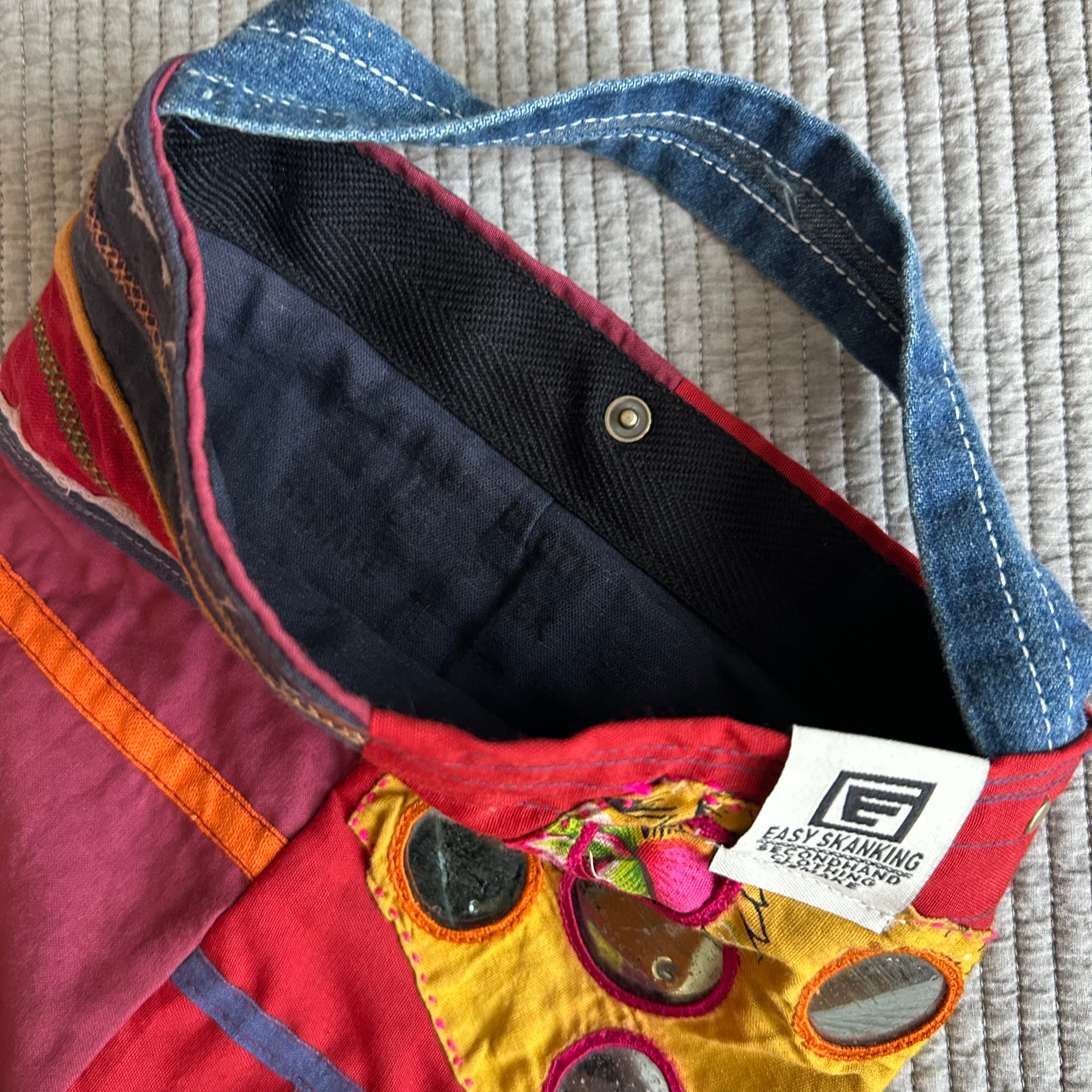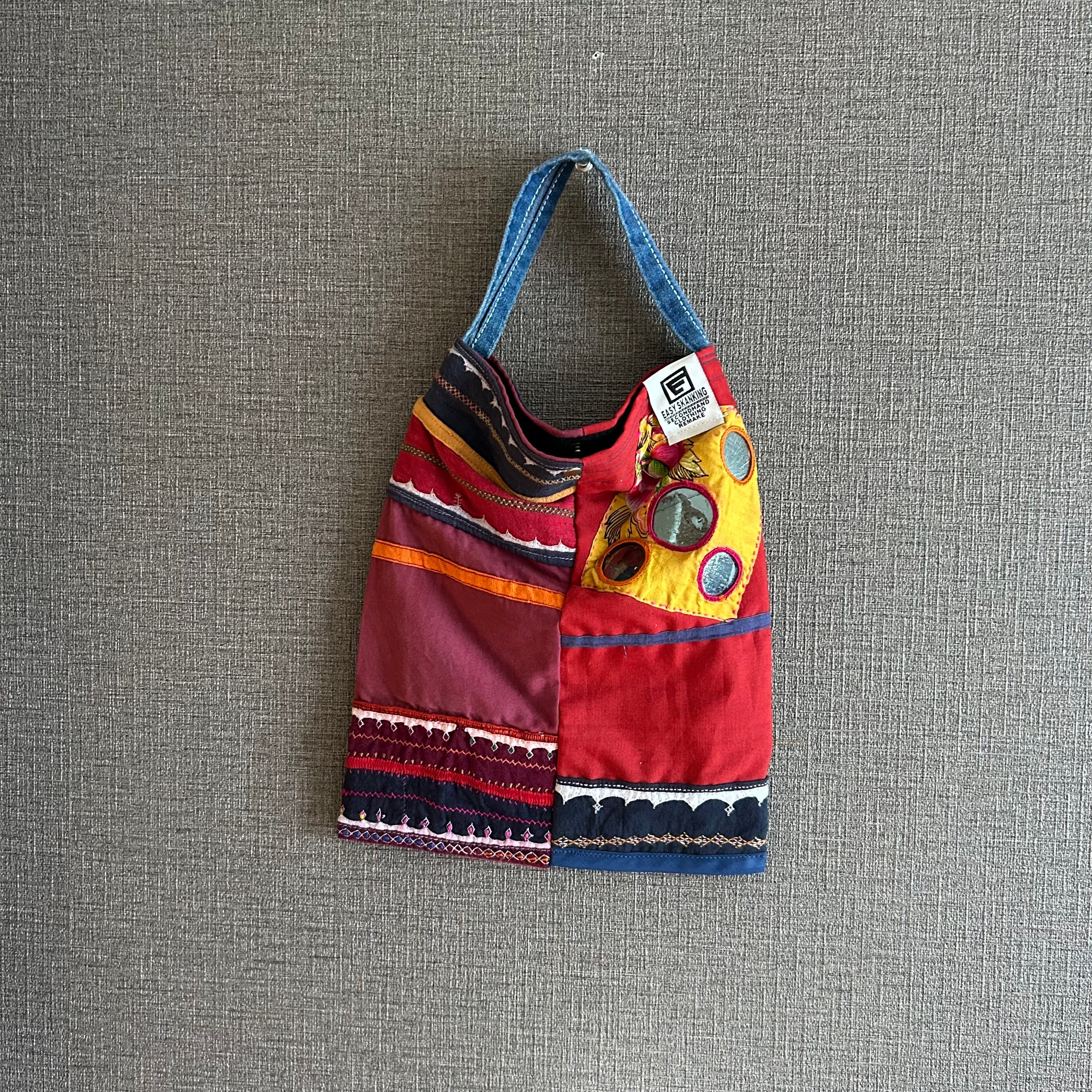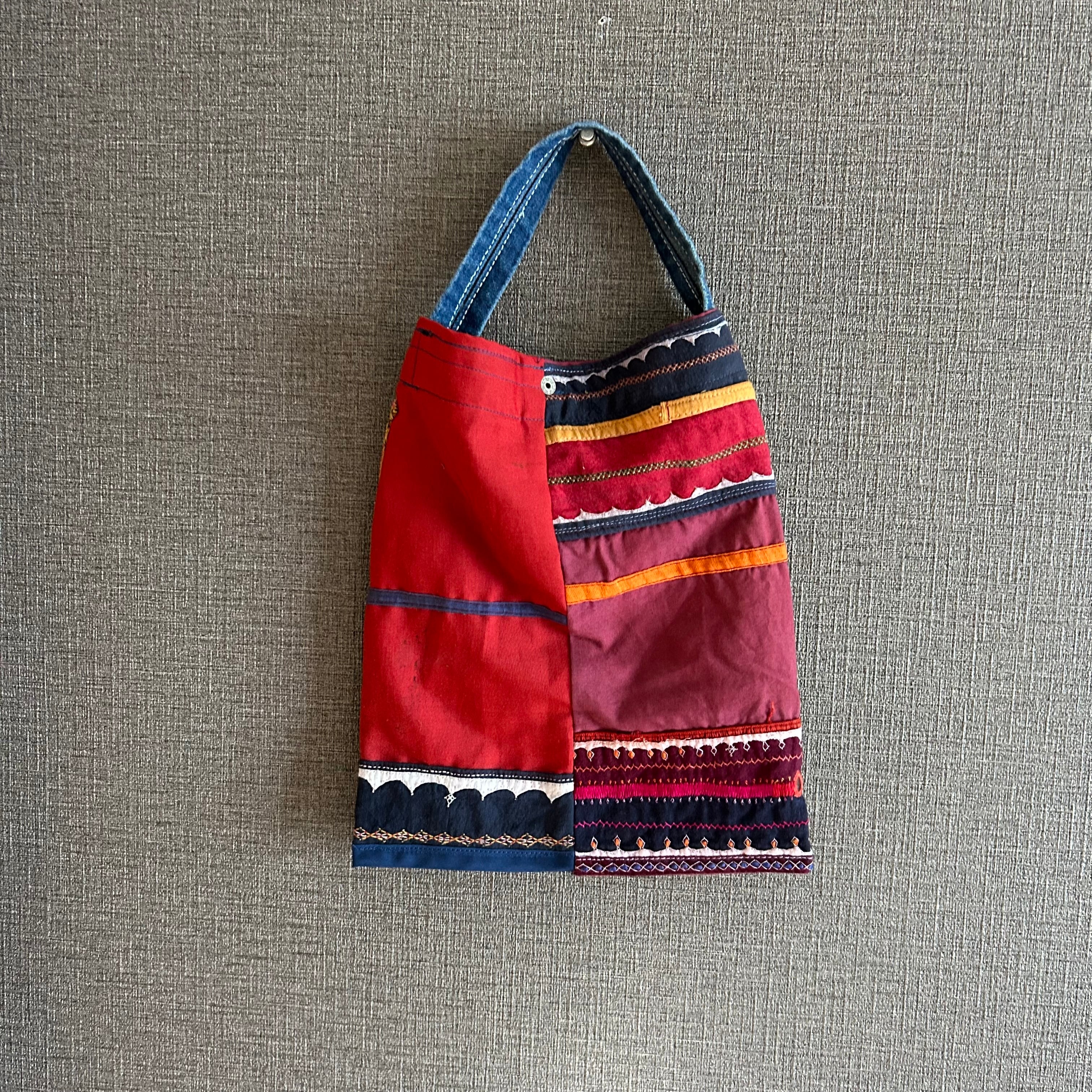 南インドのバンジャラ族の古布刺繍(アンティーク布)を組み合わせたて作られたスカートをリメイクしてBAGにしています。