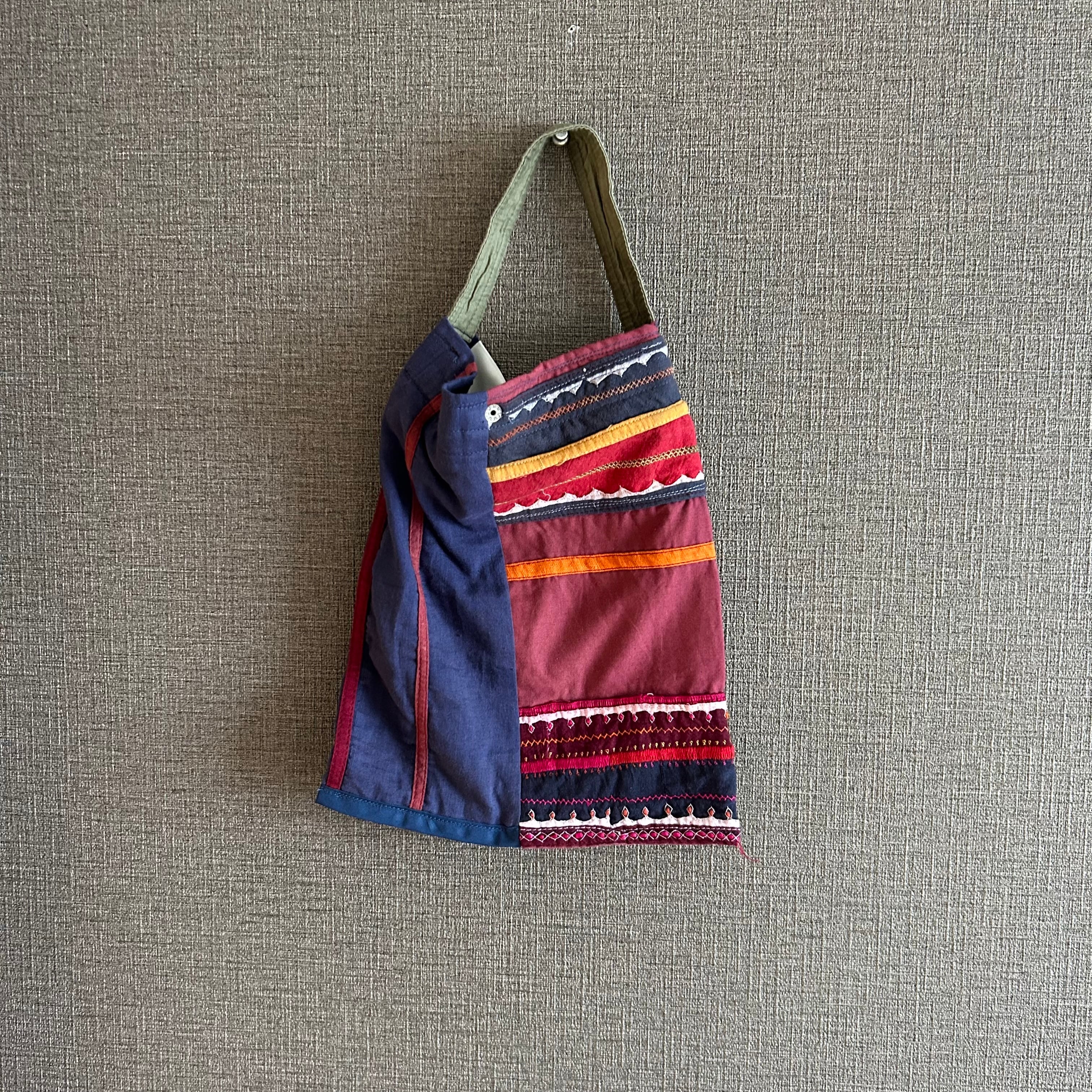 南インドのバンジャラ族の古布刺繍(アンティーク布)を組み合わせたて作られたスカートをリメイクしてBAGにしています。