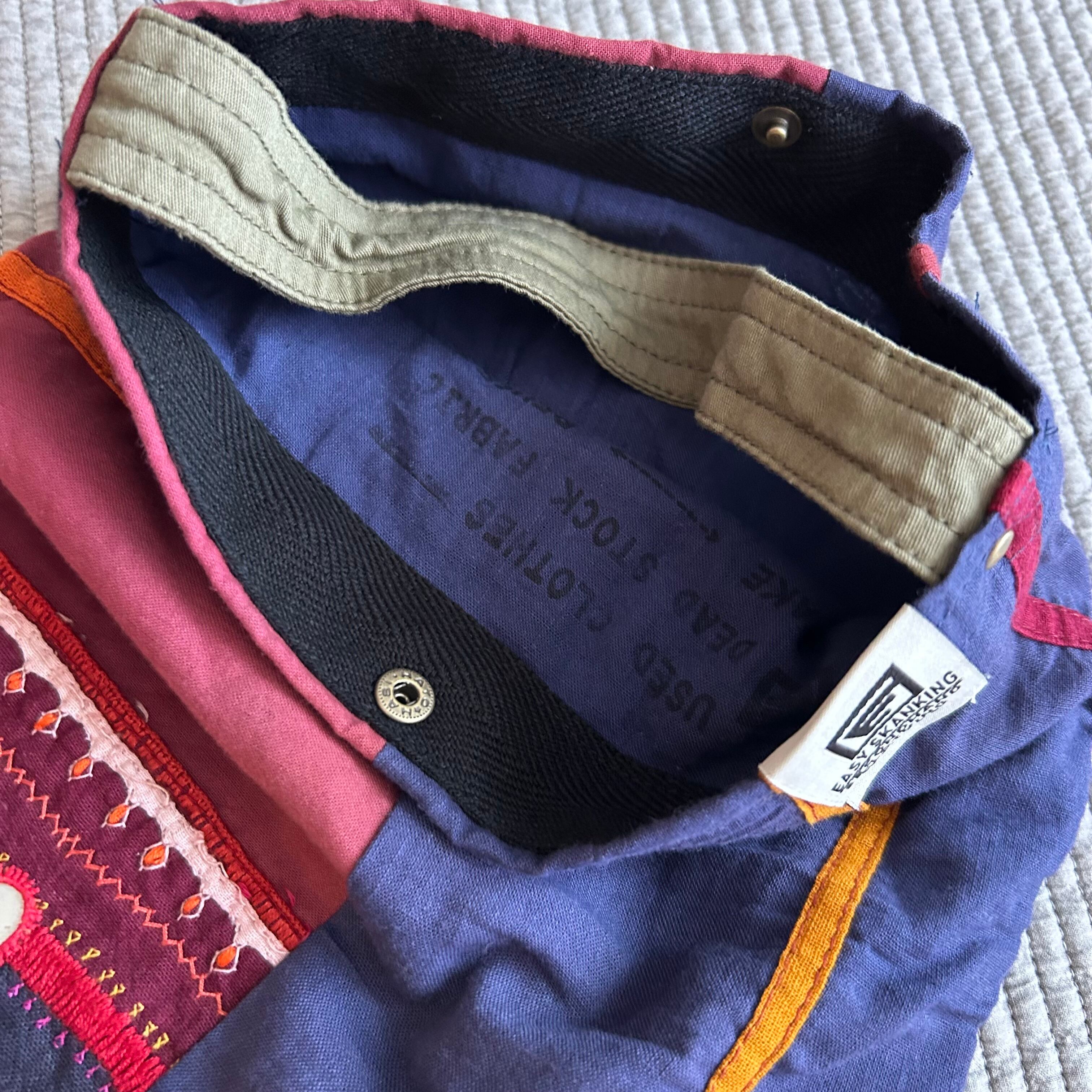 南インドのバンジャラ族の古布刺繍(アンティーク布)を使ったスカートをリメイクし、色々と組み合わせて、普段使いで楽しんでいただけるエネルギッシュなBAGを製作しました。ミニBAGです。