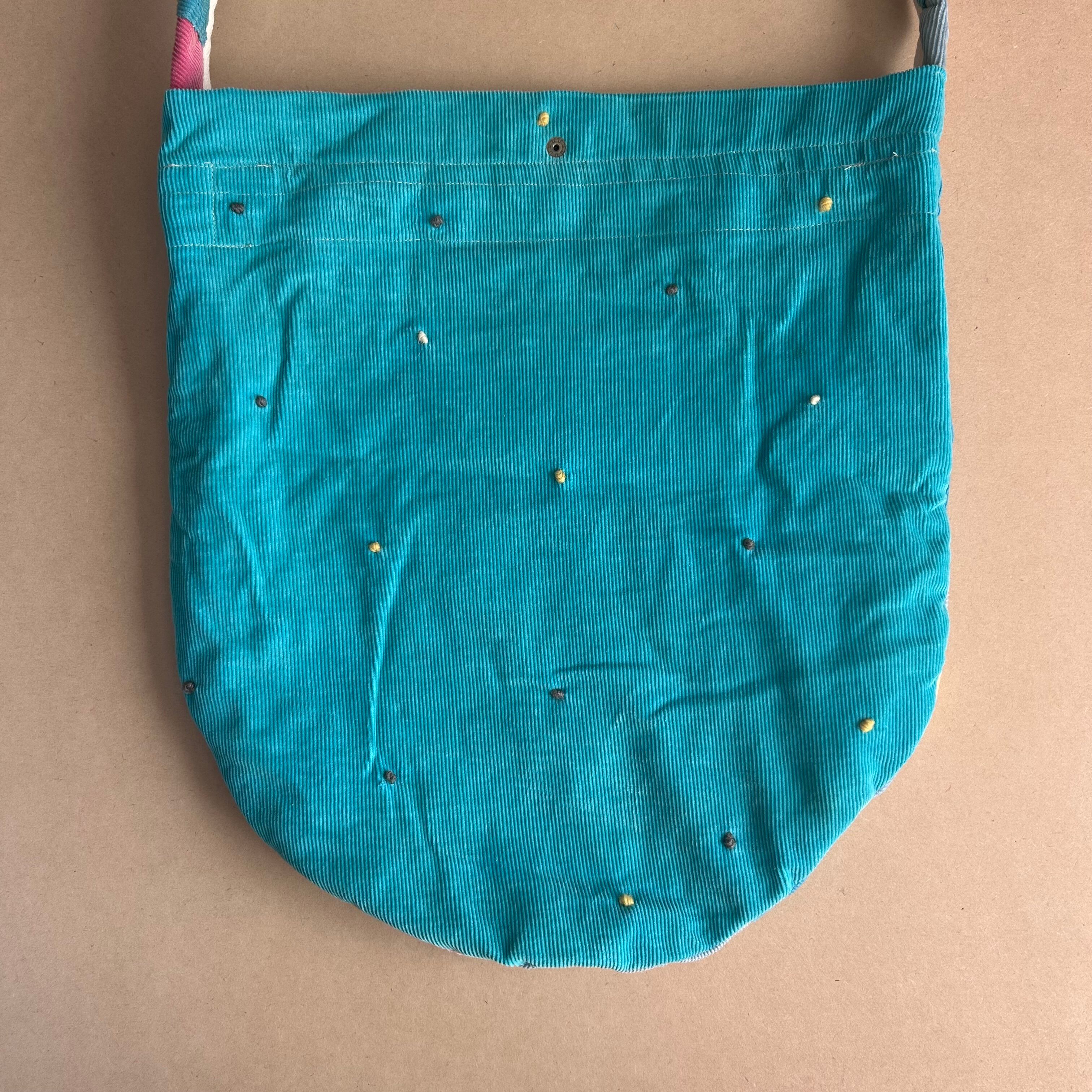 全体的に色褪せたコーデュロイの生地と色合いが異国のヴィンテージ感漂い、とっても可愛らしいBAGとなりました。