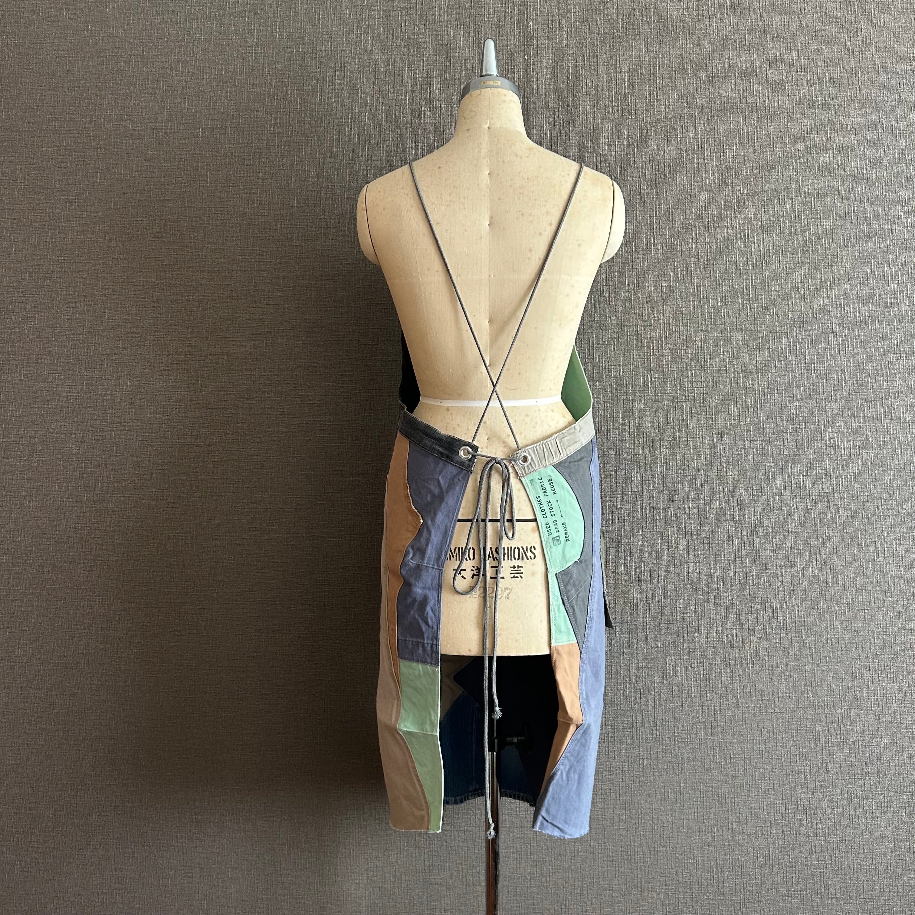 Dismantled from secondhand clothing remake and military fabrics, each piece is meticulously sewn together like patchwork to create a remade apron that truly embodies the charm of a one-of-a-kind piece.