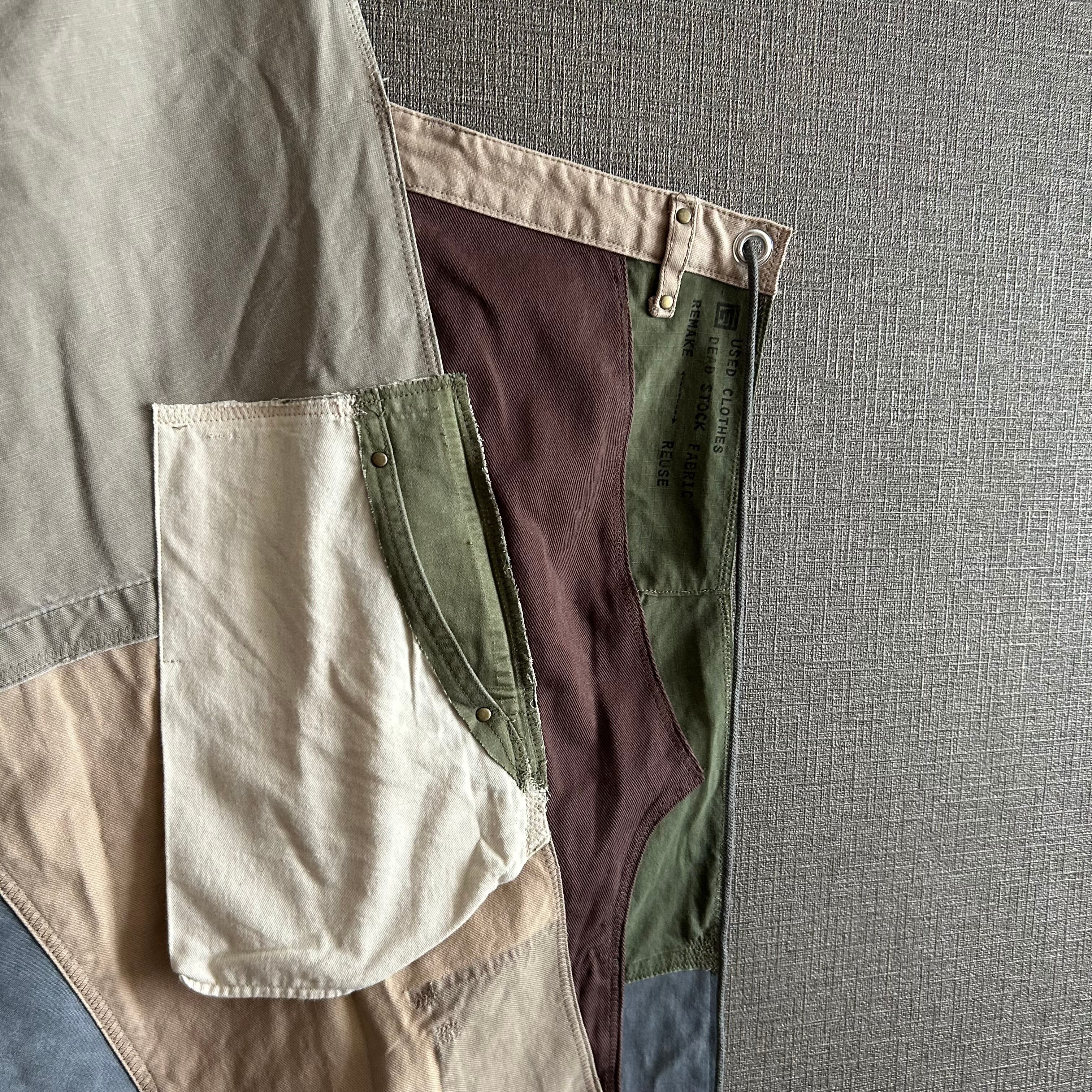 Dismantled from secondhand clothing remake and military fabrics, each piece is meticulously sewn together like patchwork to create a remade apron that truly embodies the charm of a one-of-a-kind piece.