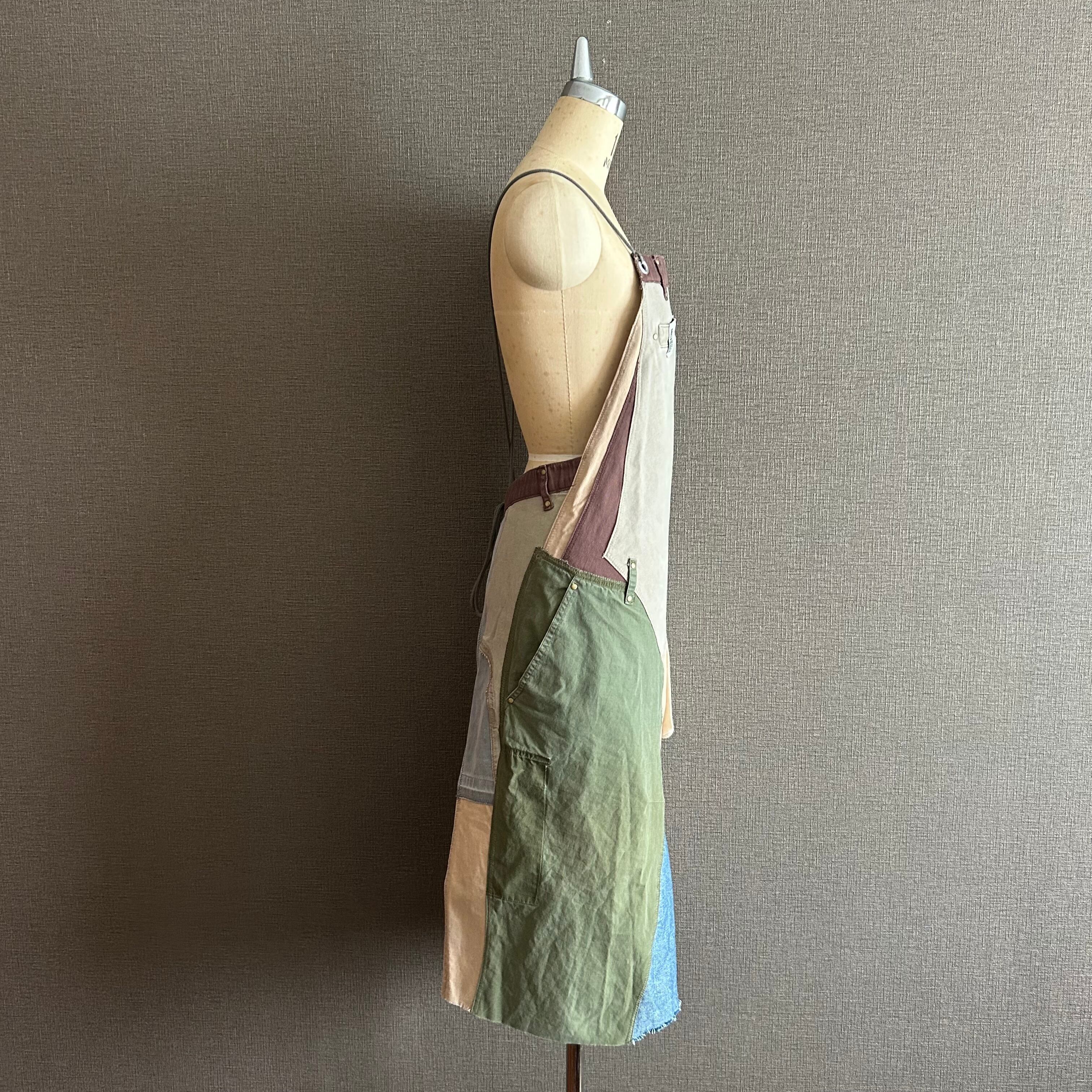 古着やミリタリーファブリックを解体し、パッチワークのように一つ一つ丁寧に縫い合わせたリメイクエプロンは、まさに一点物の魅力を存分に感じさせてくれます。