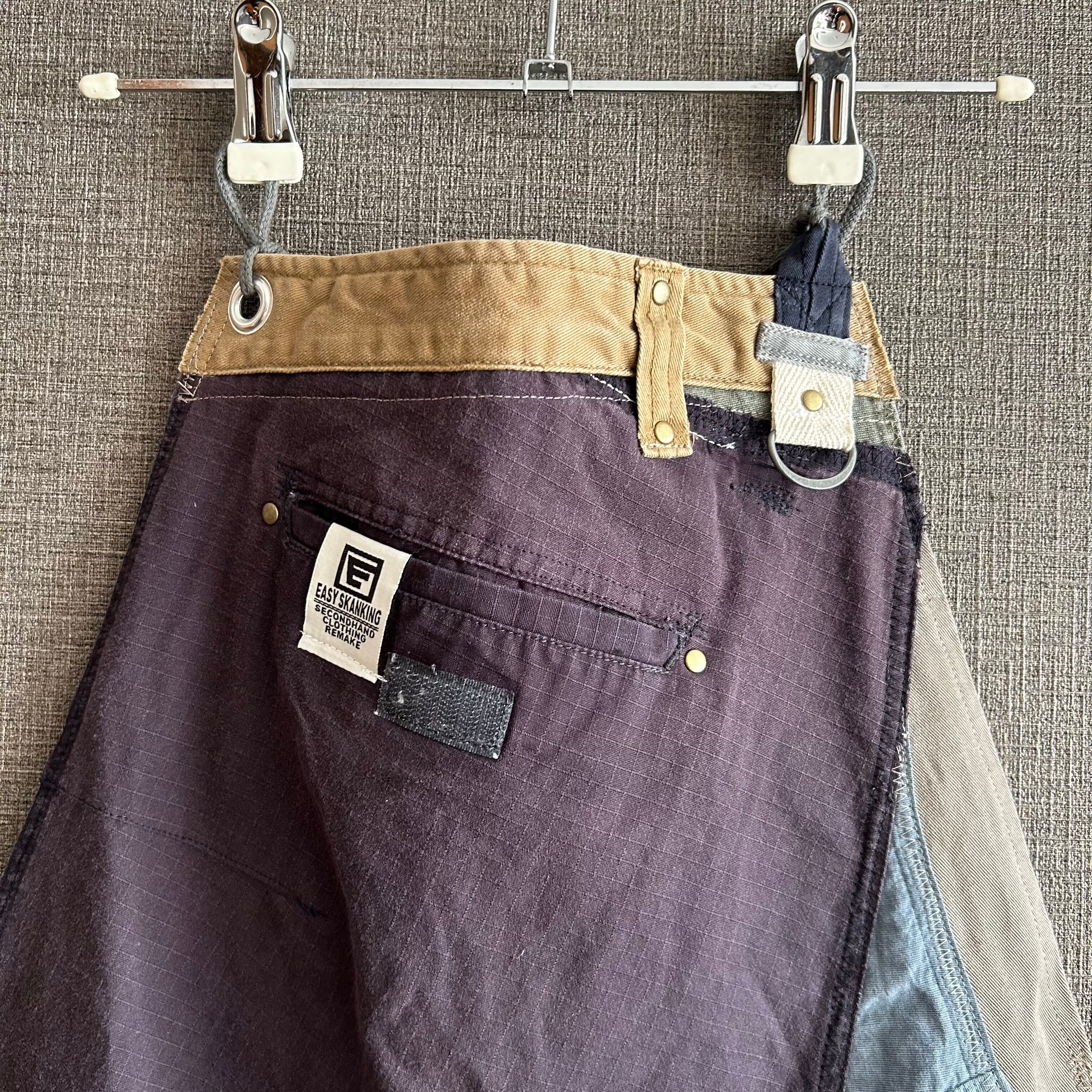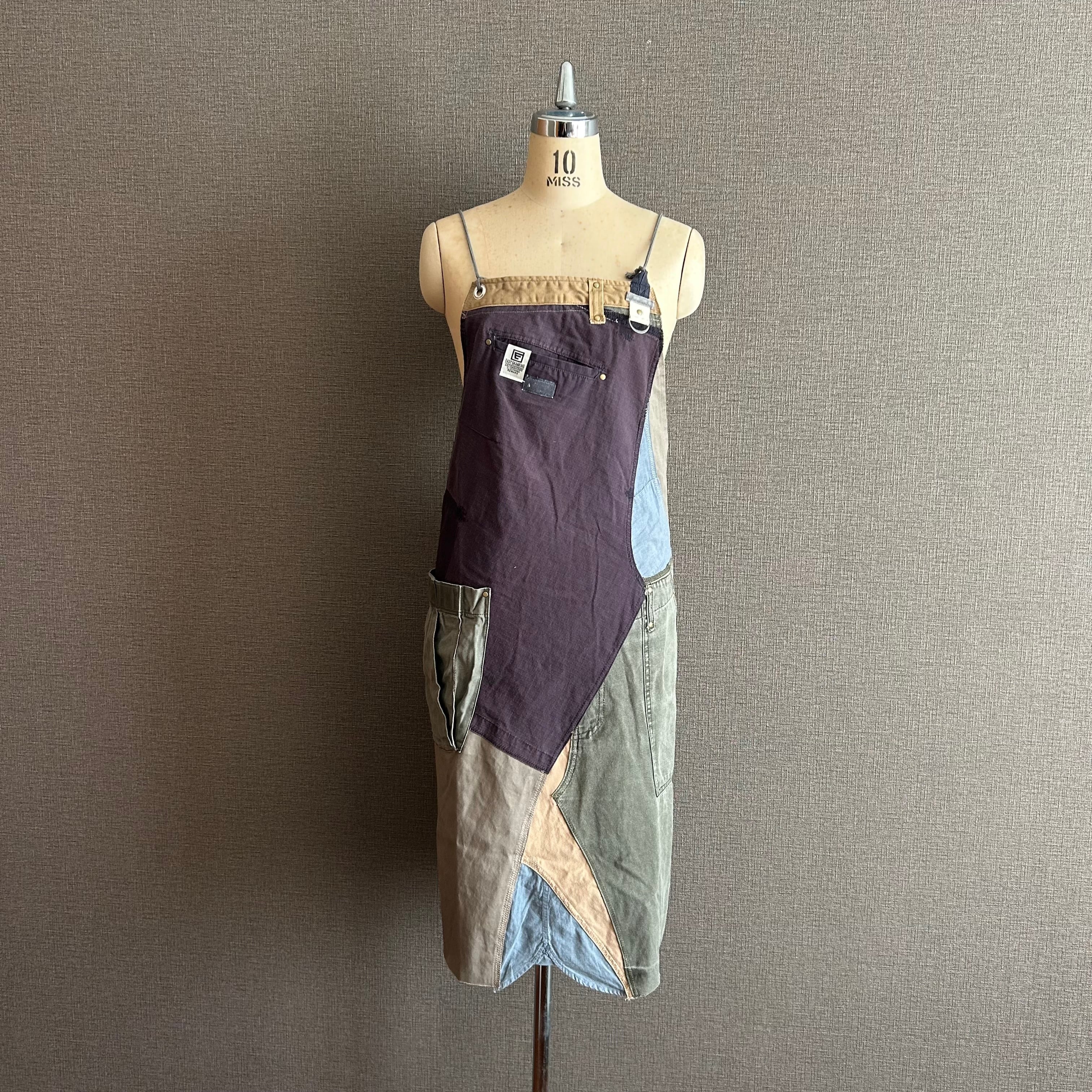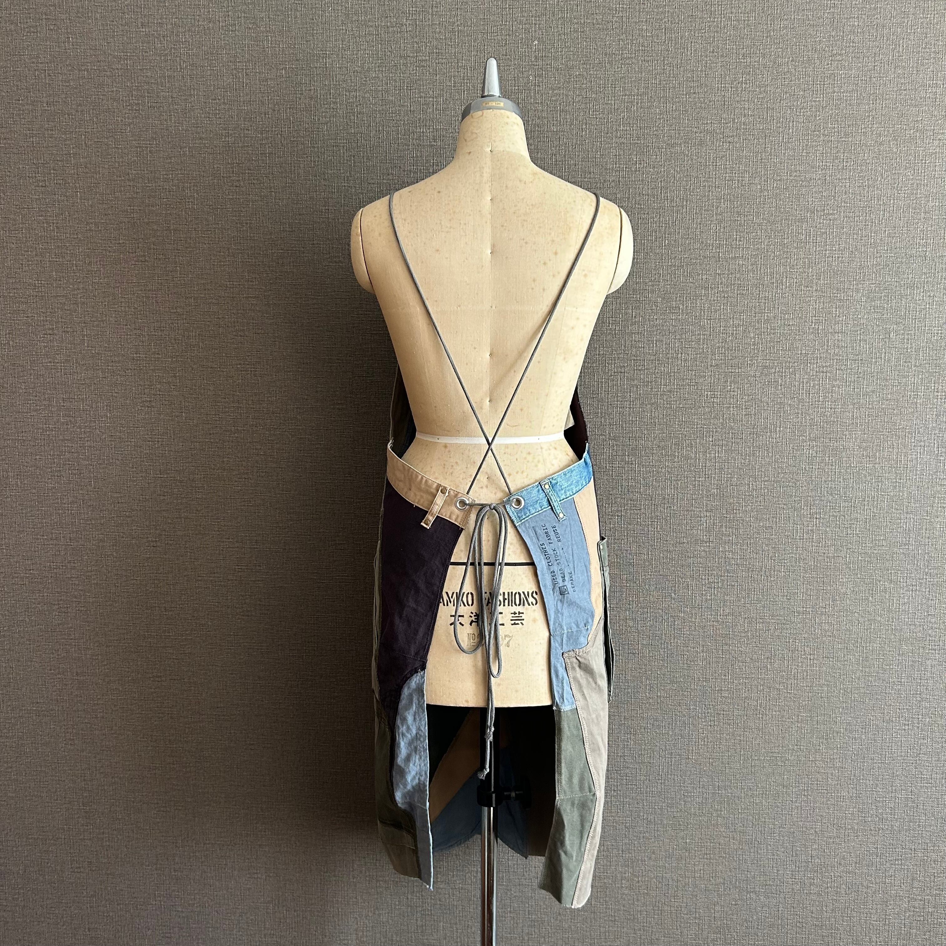 Dismantled from secondhand clothing remake and military fabrics, each piece is meticulously sewn together like patchwork to create a remade apron that truly embodies the charm of a one-of-a-kind piece.