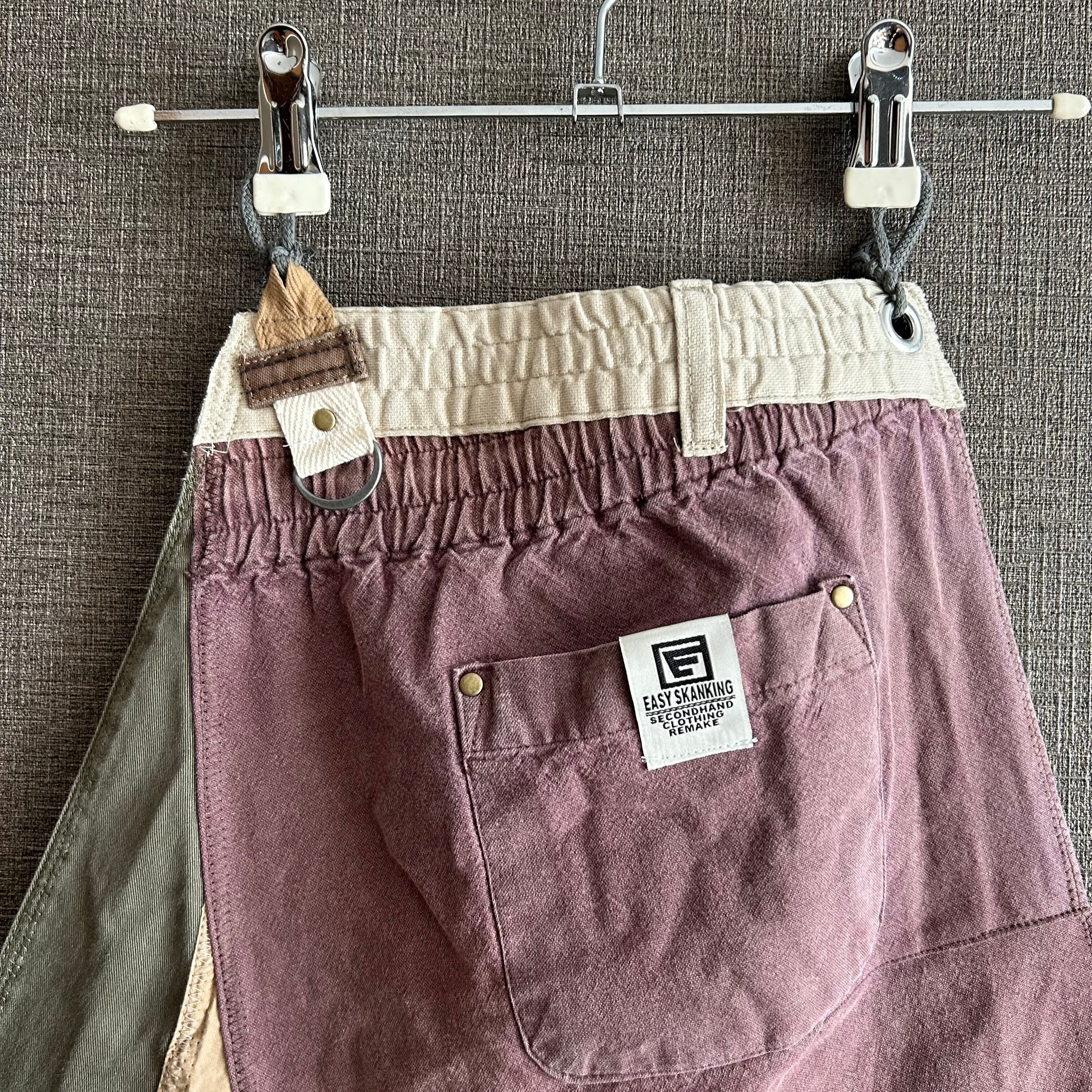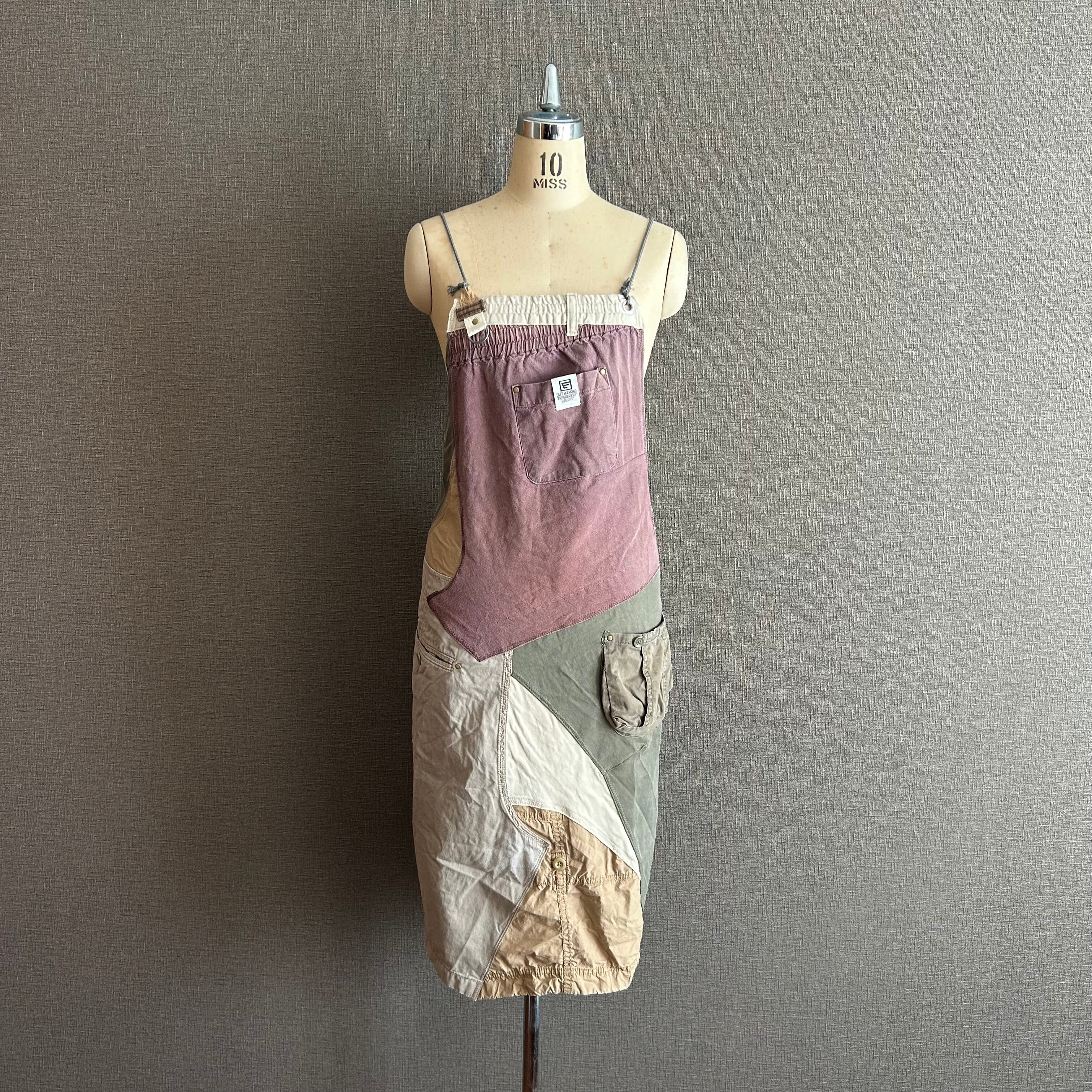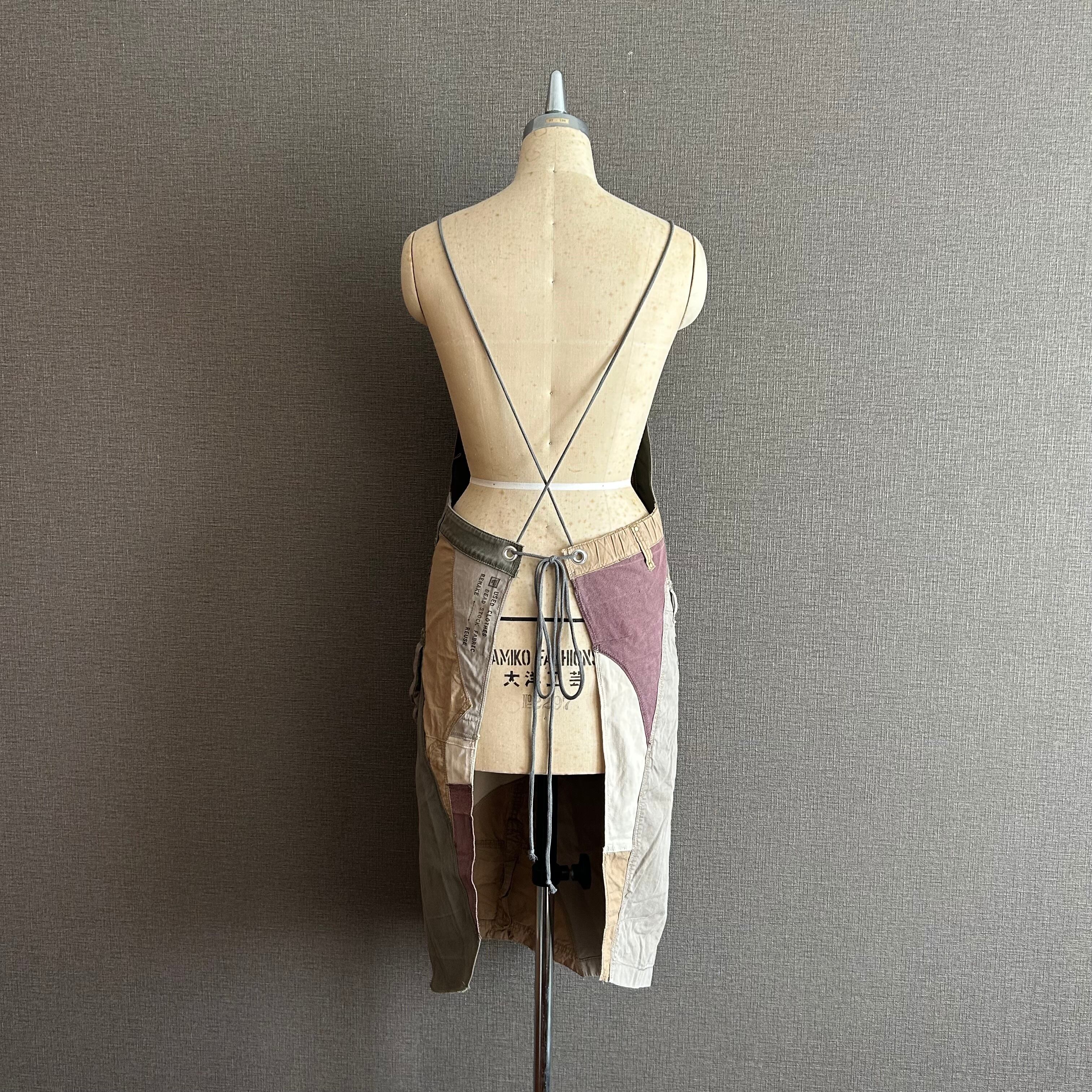 Dismantled from secondhand clothing remake and military fabrics, each piece is meticulously sewn together like patchwork to create a remade apron that truly embodies the charm of a one-of-a-kind piece.
