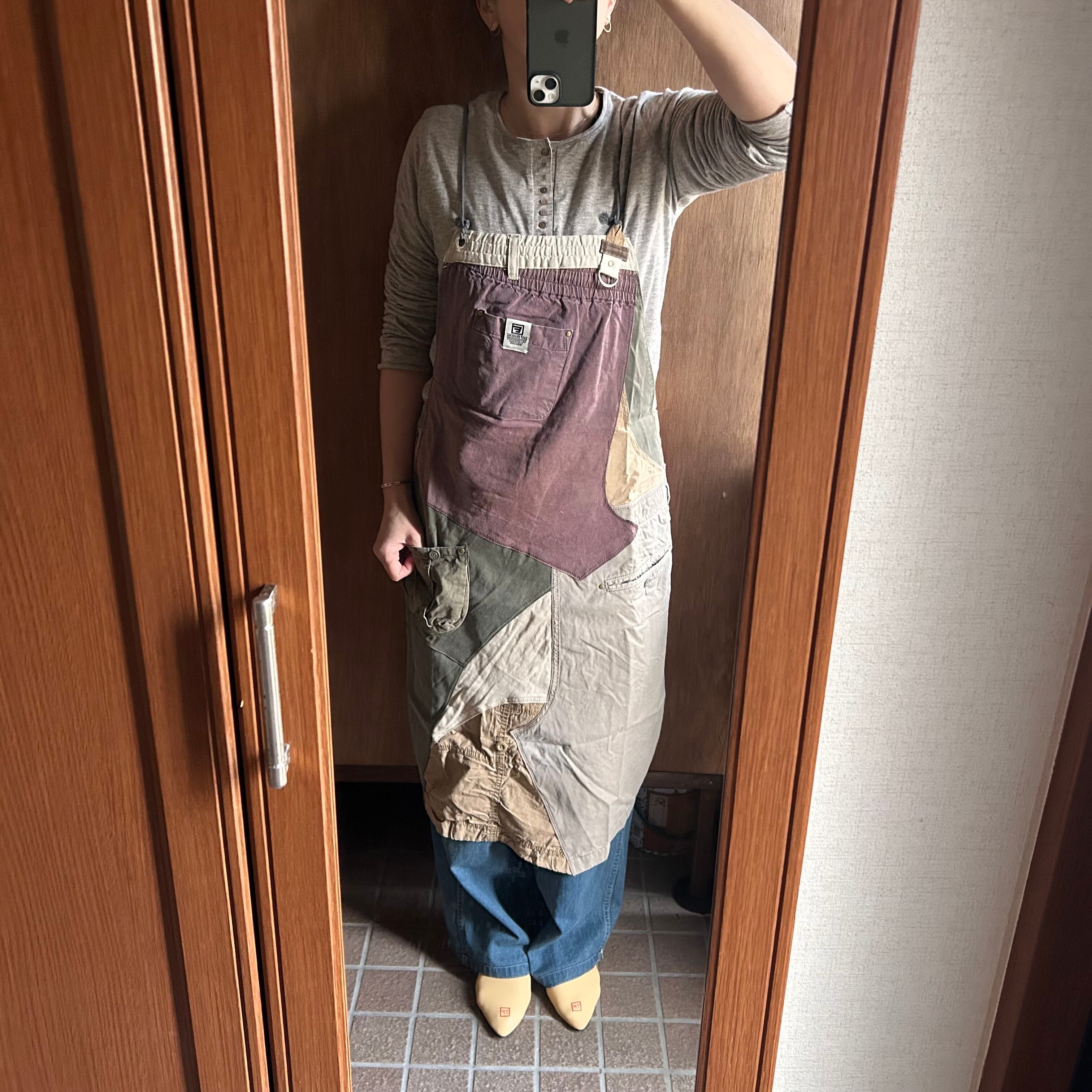 古着やミリタリーファブリックを解体し、パッチワークのように一つ一つ丁寧に縫い合わせたリメイクエプロンは、まさに一点物の魅力を存分に感じさせてくれます。