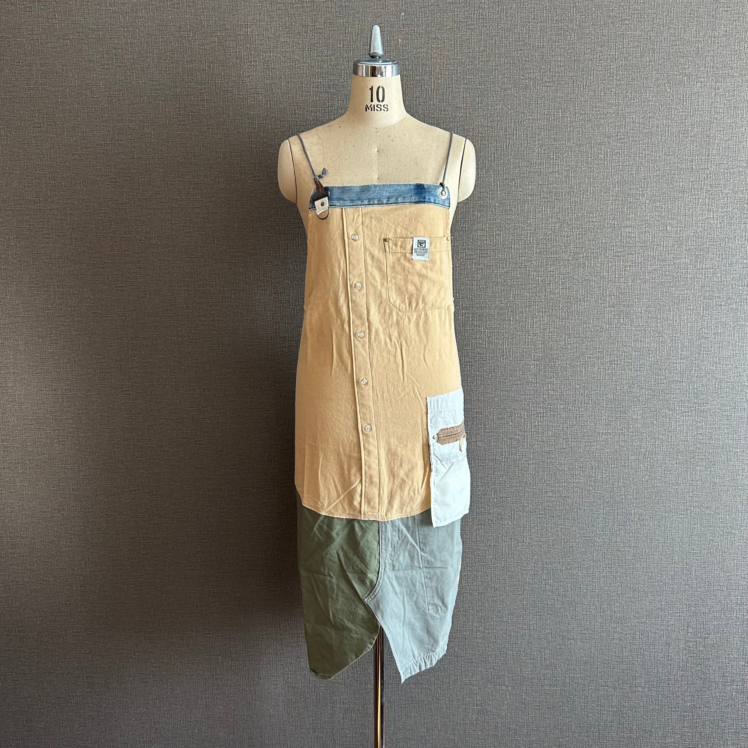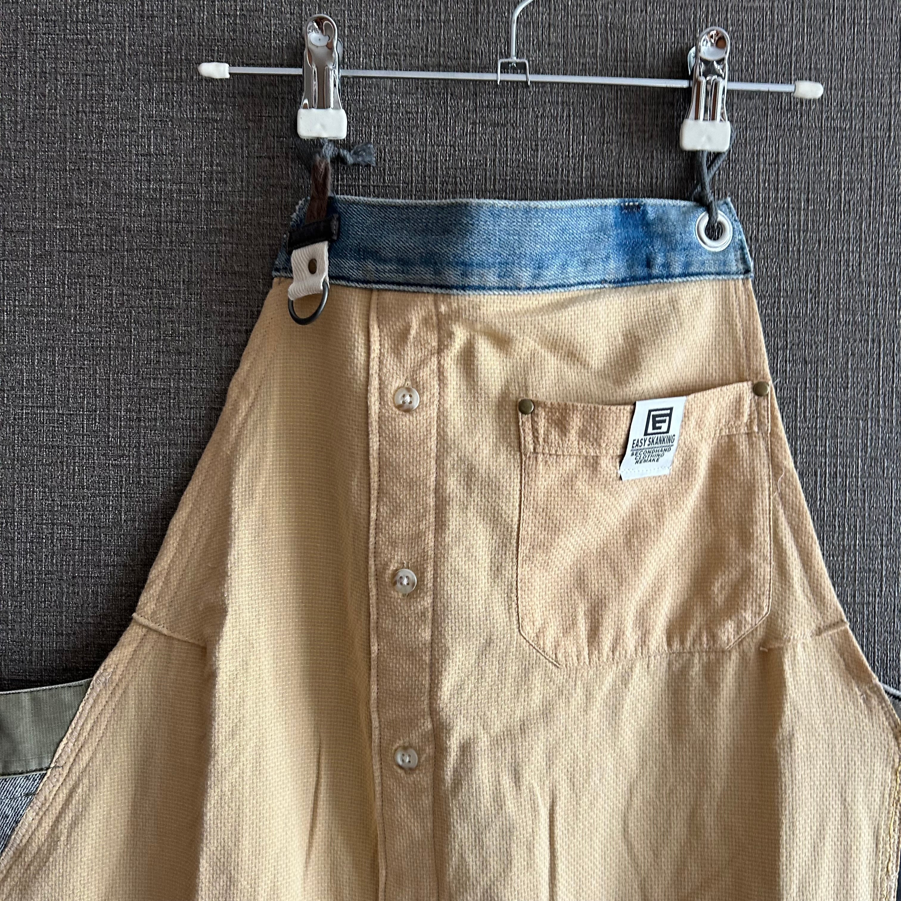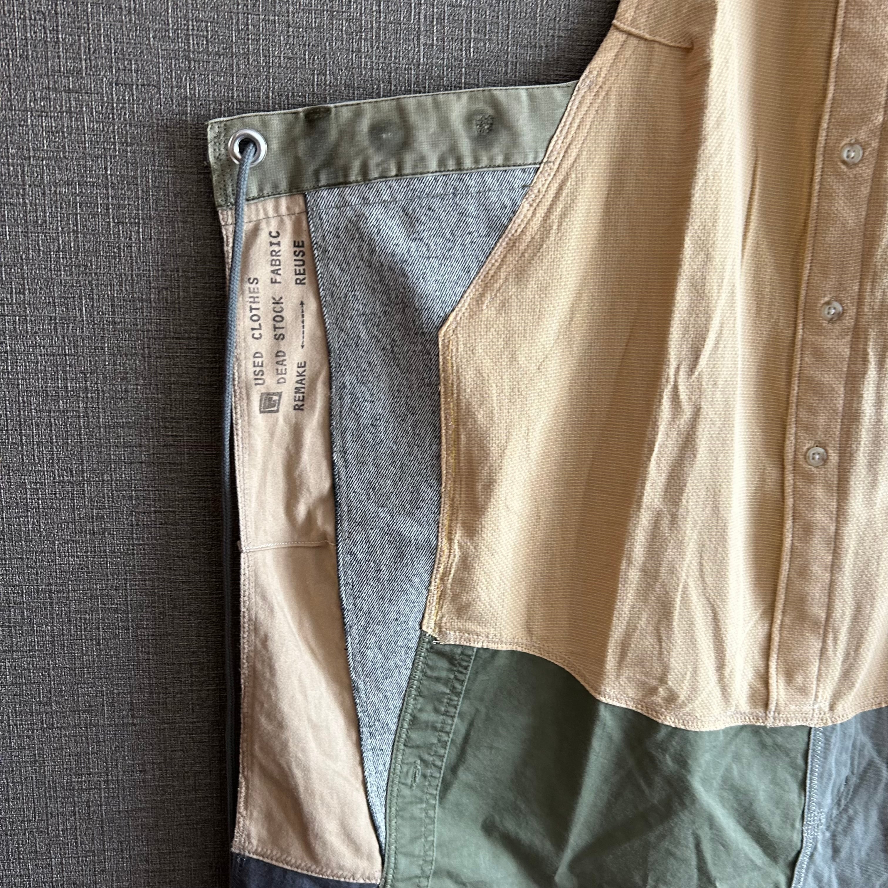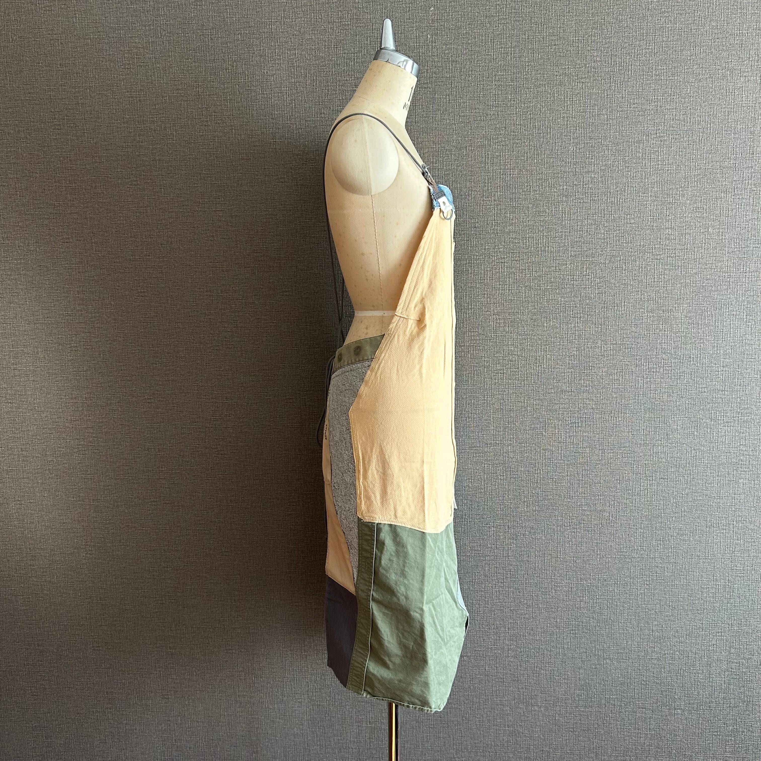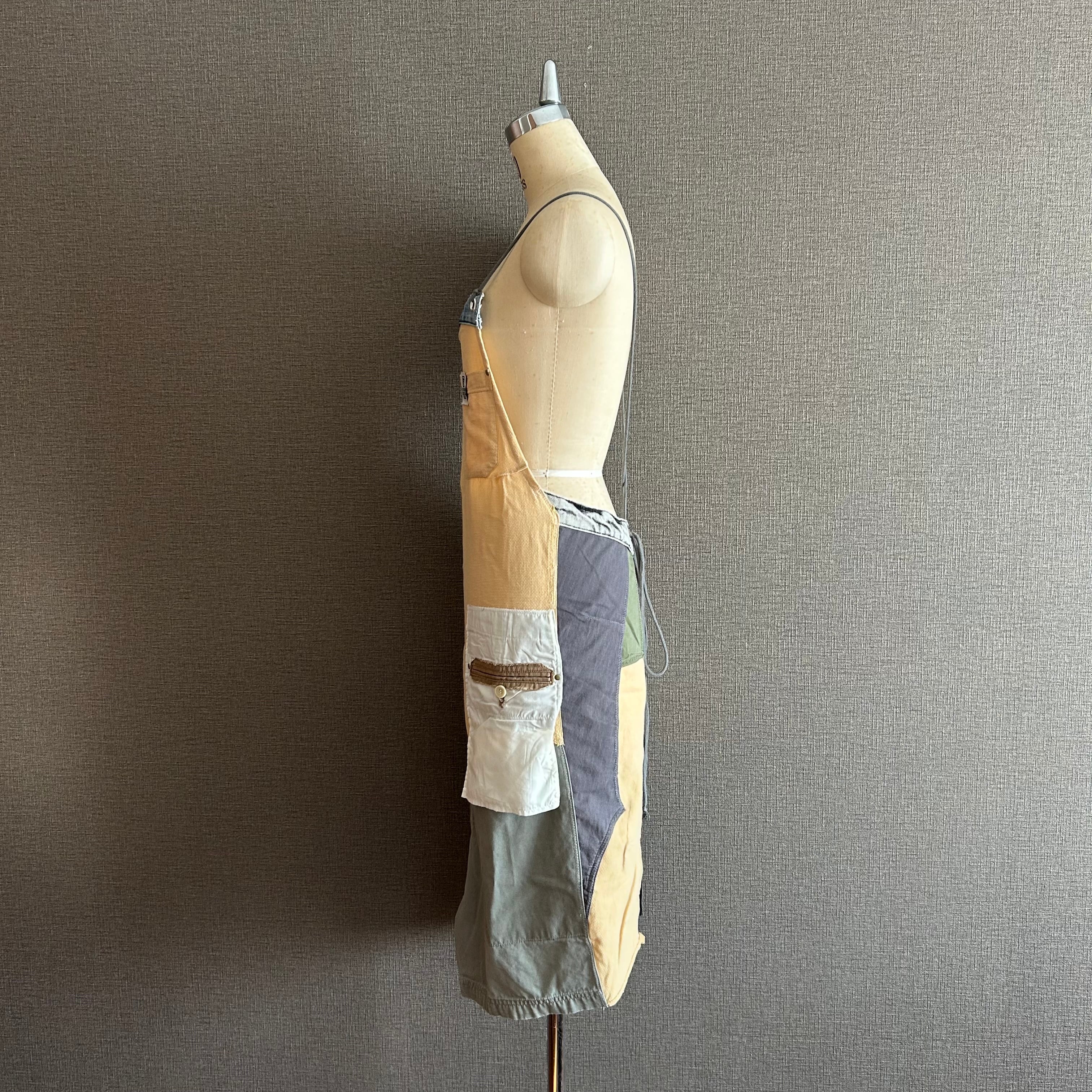 Dismantled from secondhand clothing remake and military fabrics, each piece is meticulously sewn together like patchwork to create a remade apron that truly embodies the charm of a one-of-a-kind piece.