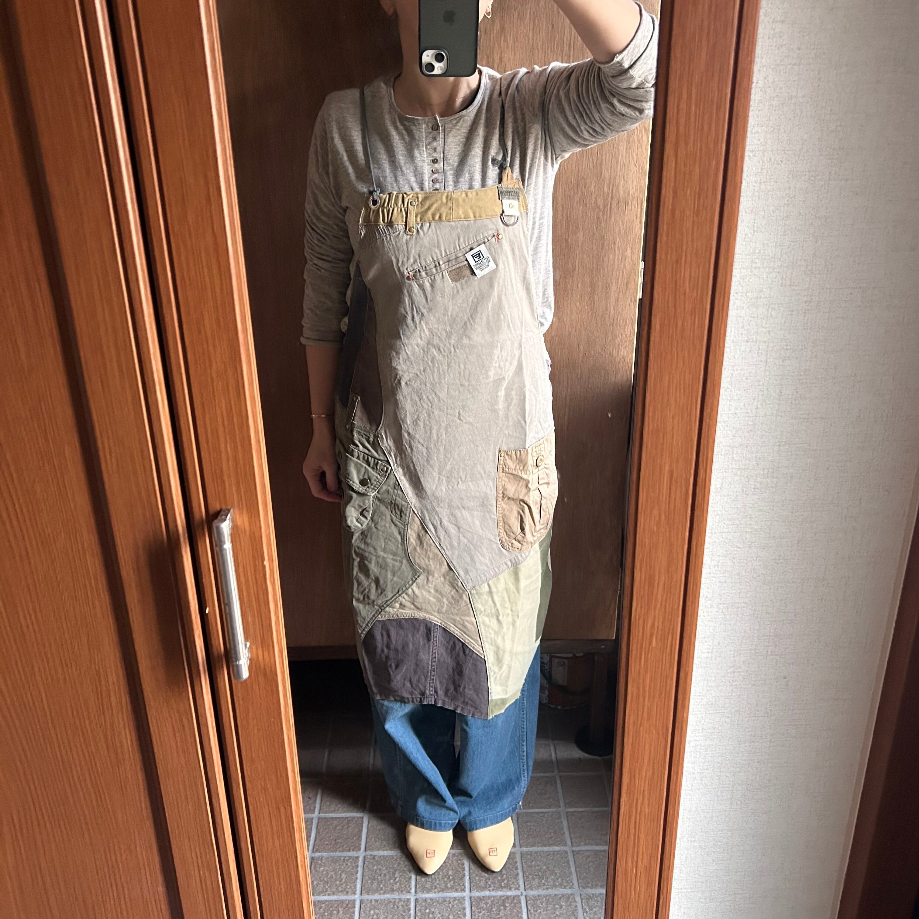 古着やミリタリーファブリックを解体し、パッチワークのように一つ一つ丁寧に縫い合わせたリメイクエプロンは、まさに一点物の魅力を存分に感じさせてくれます。