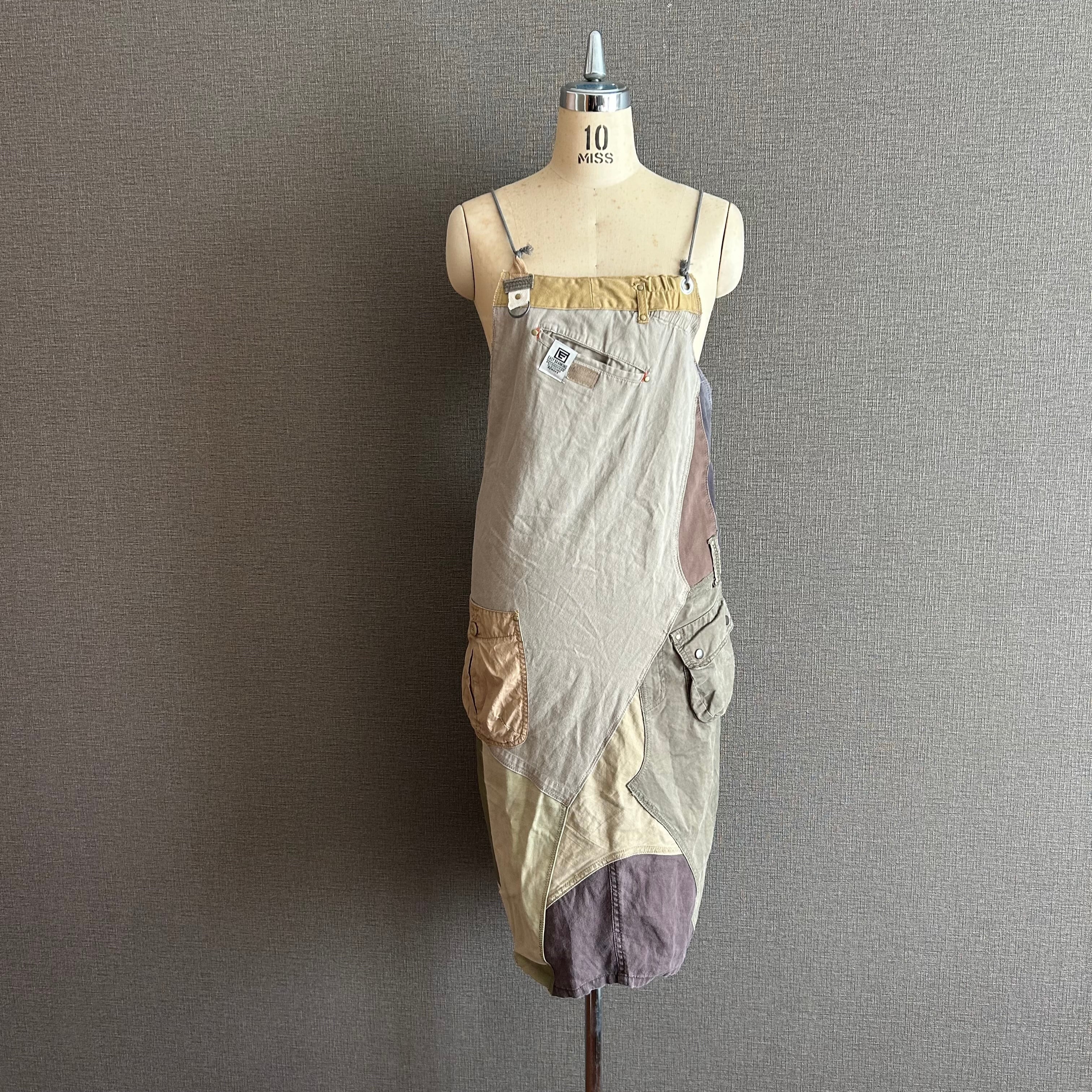 Dismantled from secondhand clothing remake and military fabrics, each piece is meticulously sewn together like patchwork to create a remade apron that truly embodies the charm of a one-of-a-kind piece.