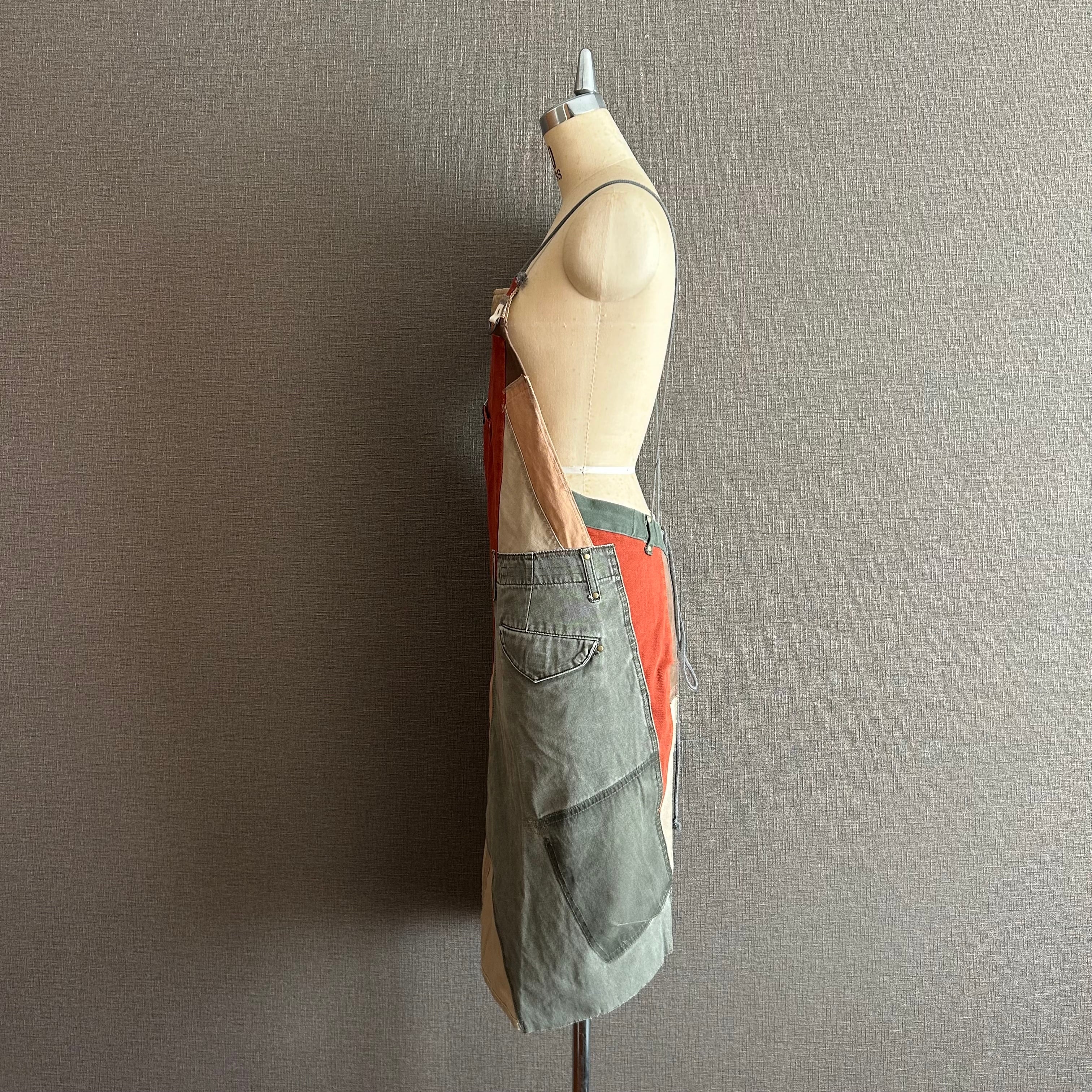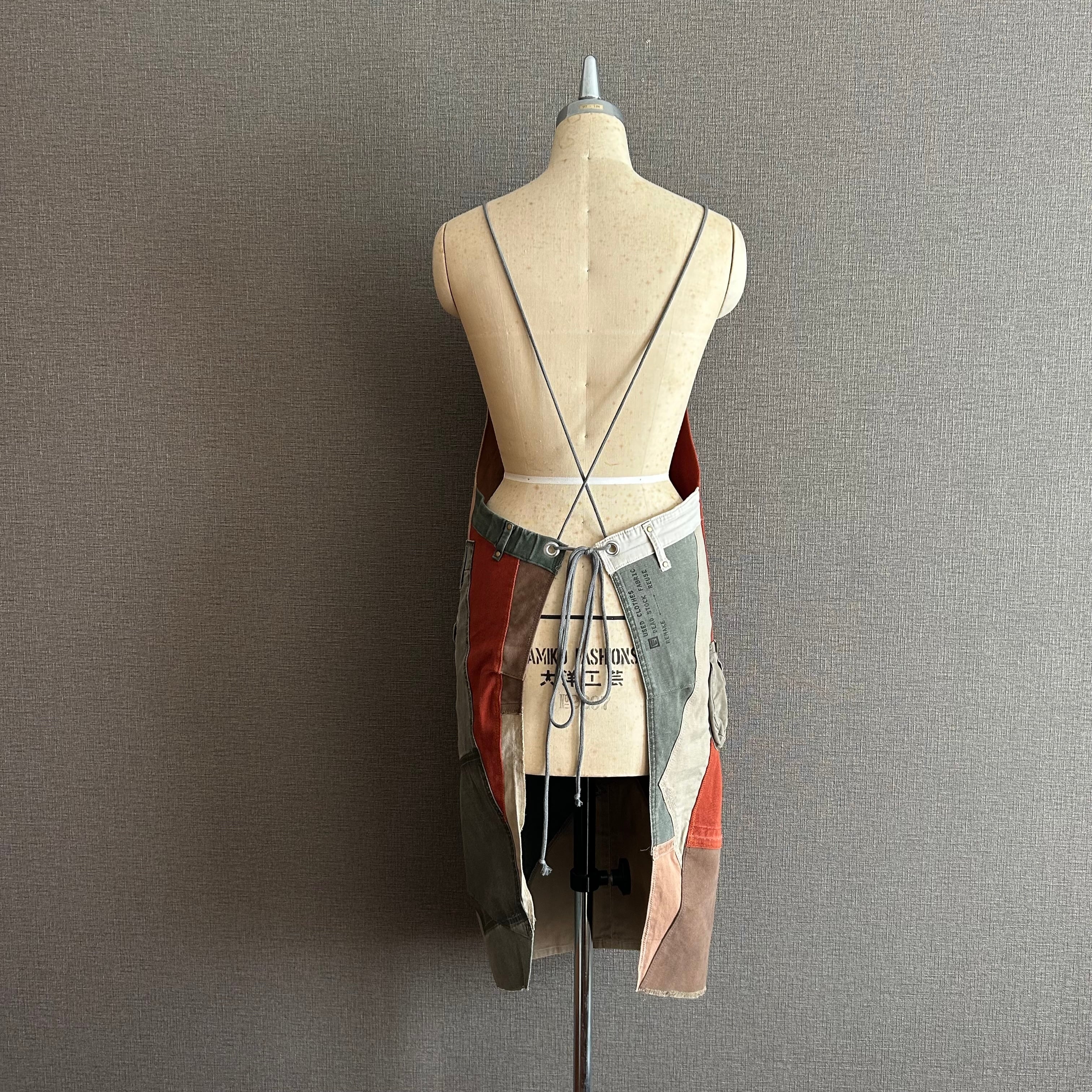 Dismantled from vintage clothing and military fabrics, each piece is meticulously sewn together like patchwork to create a remade apron that truly embodies the charm of a one-of-a-kind piece.