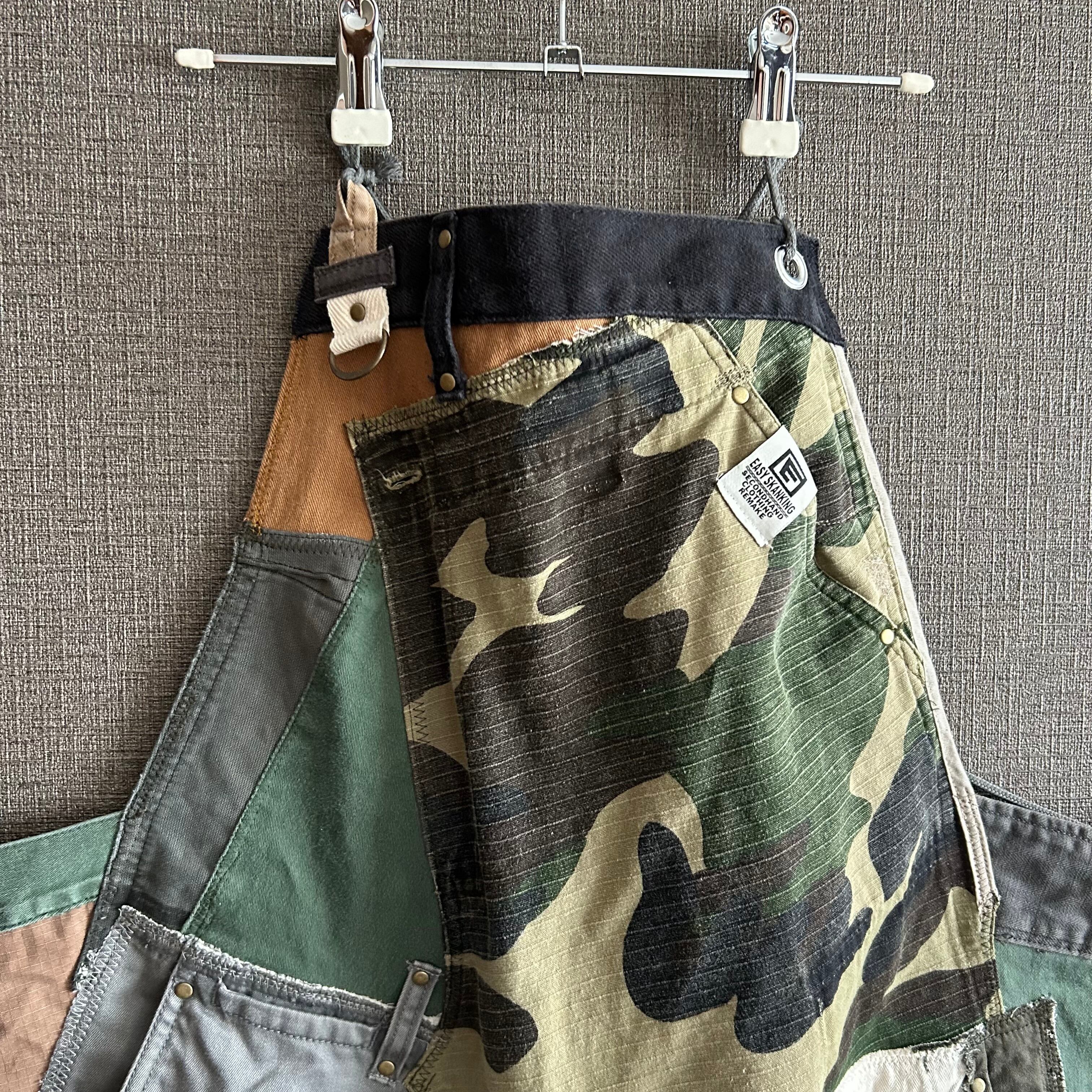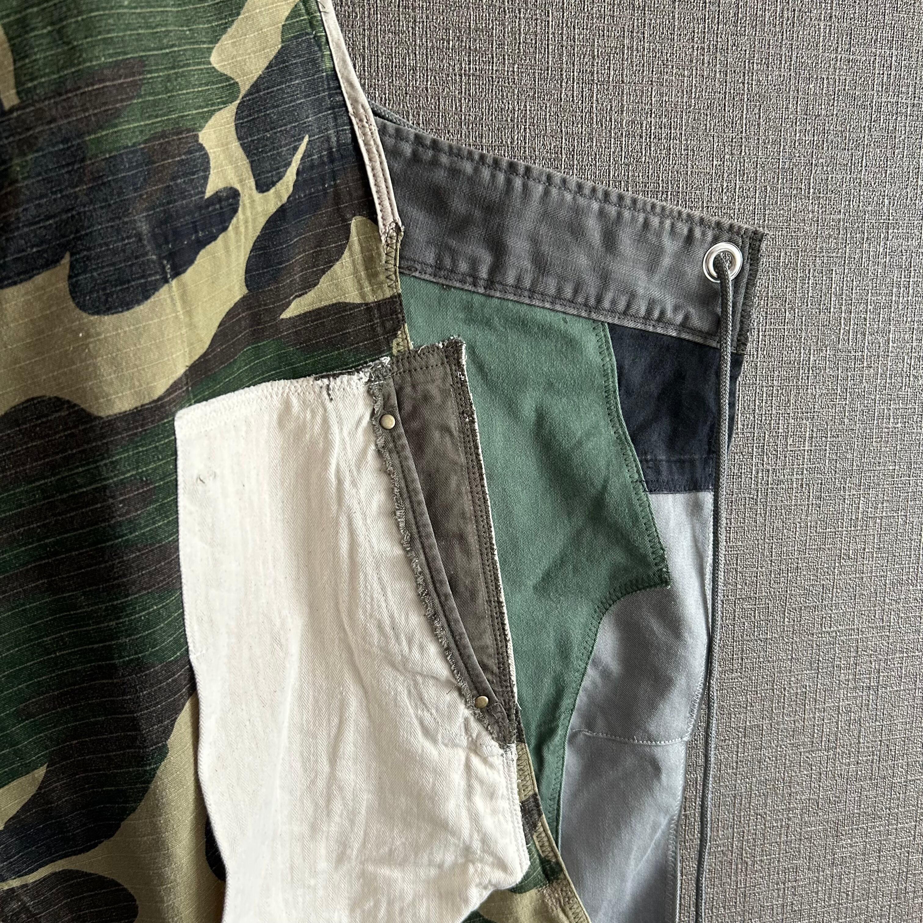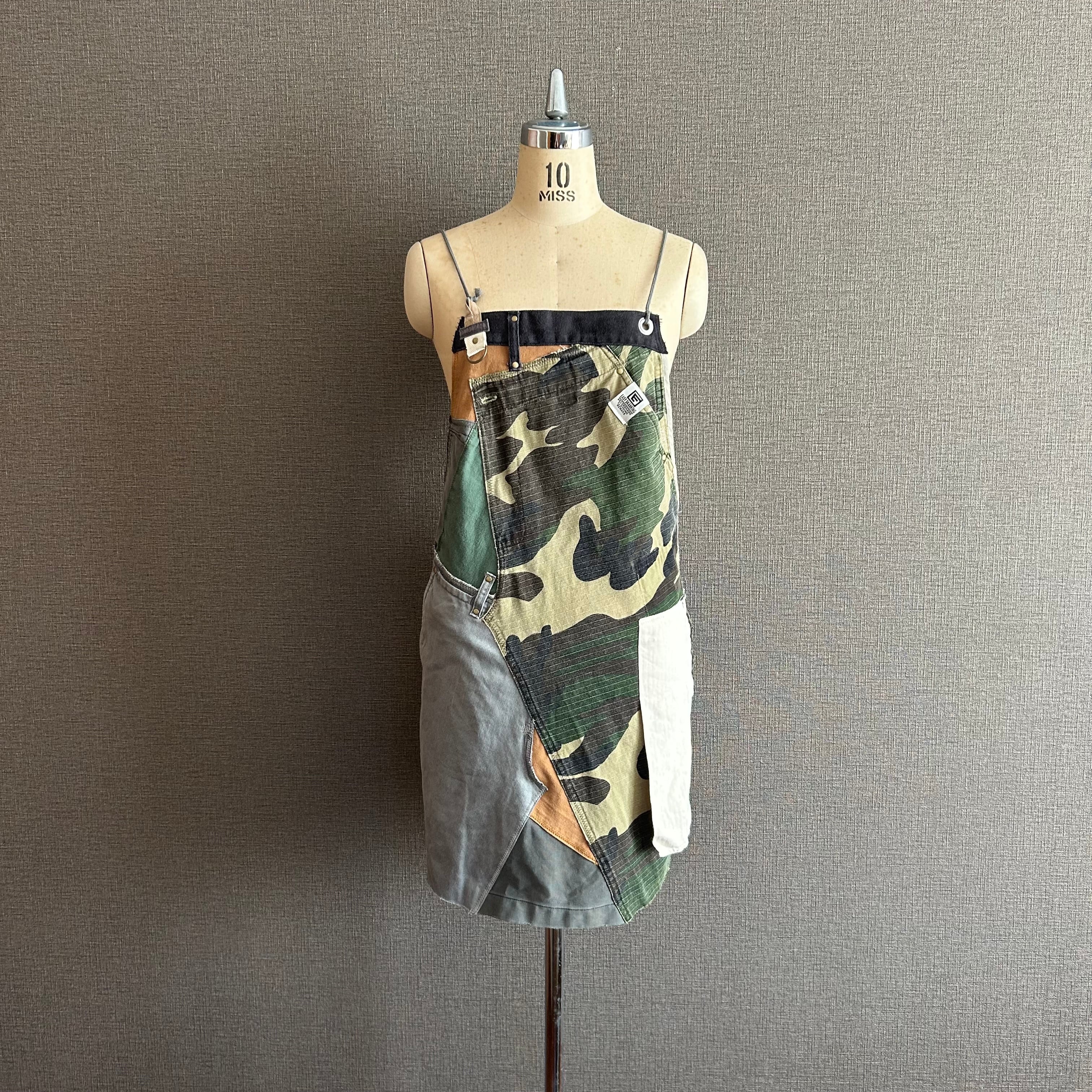 Dismantled from vintage clothing and military fabrics, each piece is meticulously sewn together like patchwork to create a remade apron that truly embodies the charm of a one-of-a-kind piece.