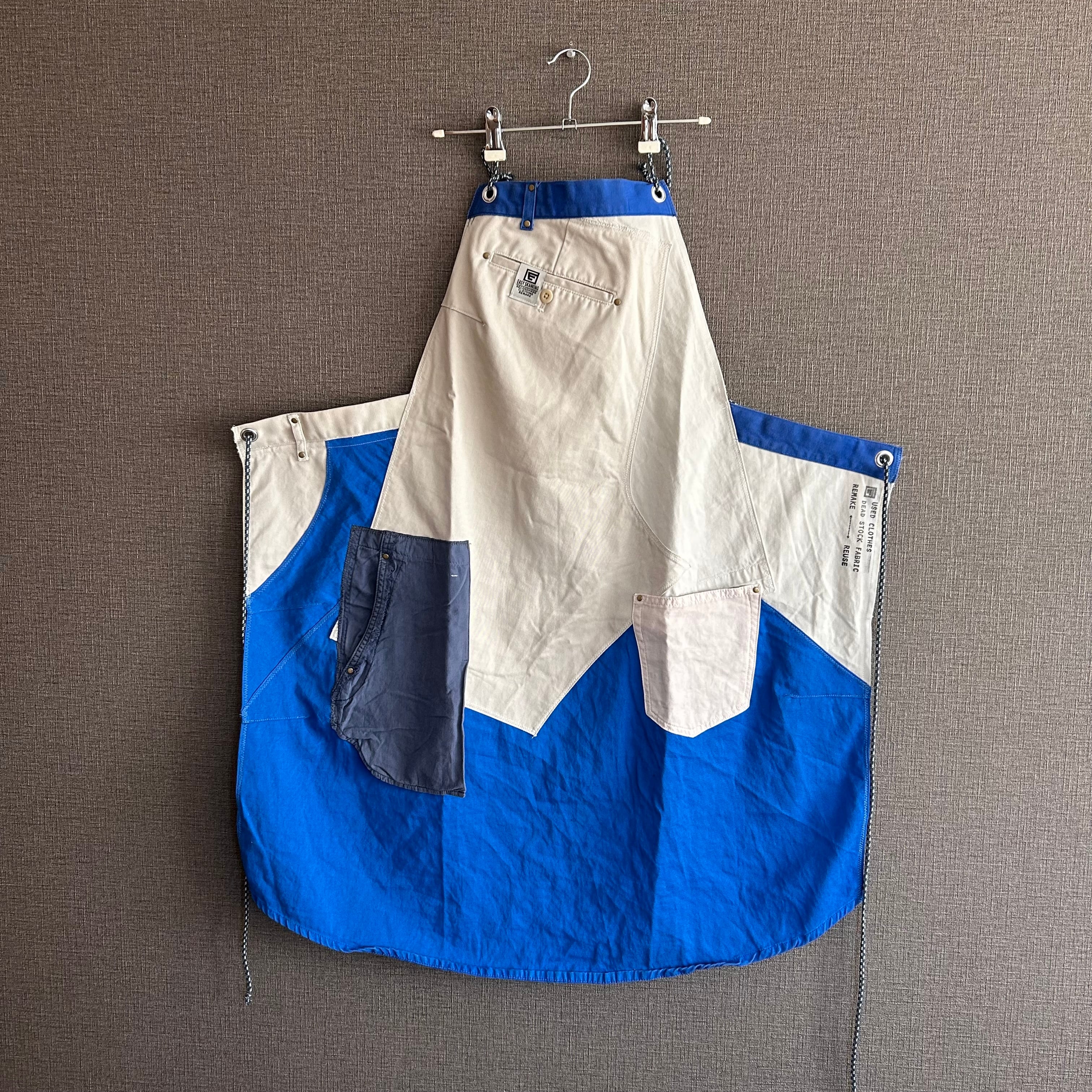 Dismantled from vintage clothing and military fabrics, each piece is meticulously sewn together like patchwork to create a remade apron that truly embodies the charm of a one-of-a-kind piece.