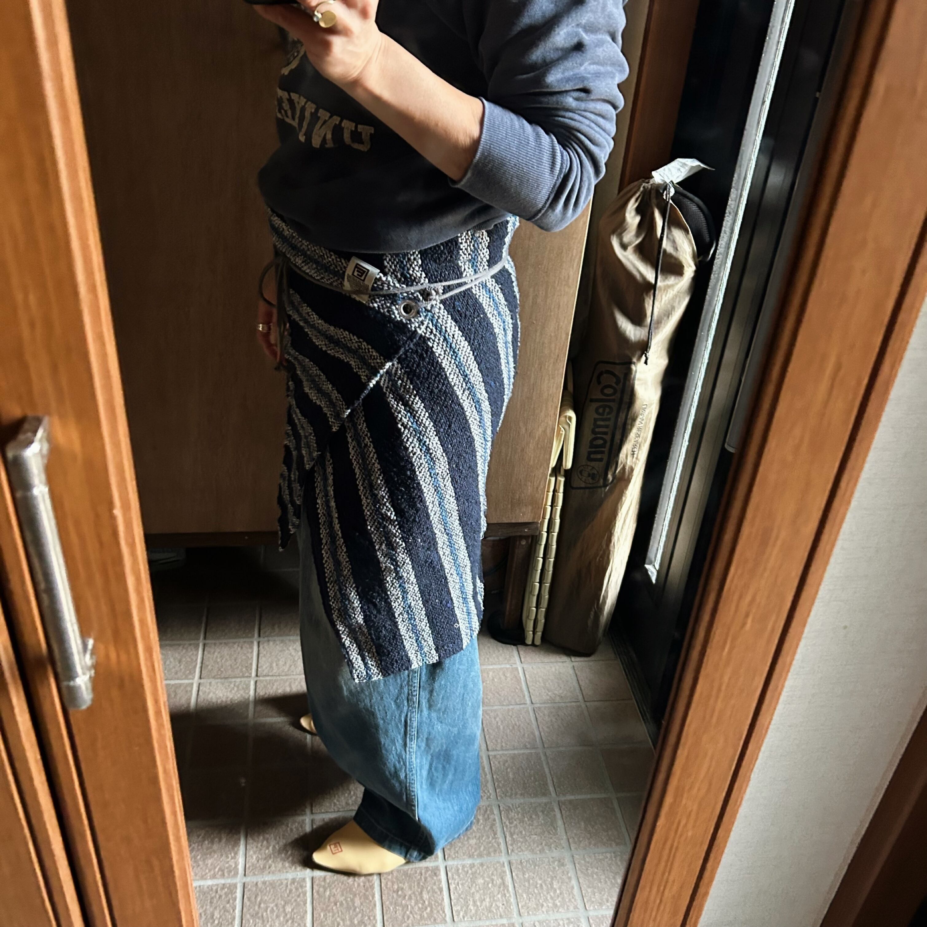 腰巻きエプロンにはポケットは付けておらず、マフラーを巻く感覚で腰にさっと巻いてコーディネートのアクセントにいかがでしょうか。